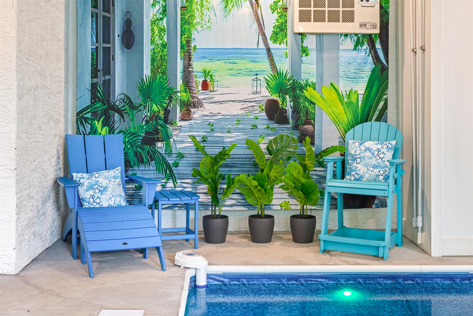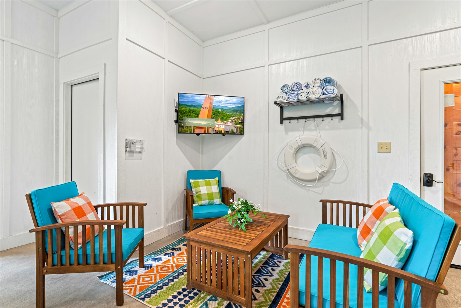 Still Waters features your very own private indoor heated swimming pool. The pool is heated to 82 degrees all year and is 3.5 feet deep. It’s decorated with a fun beach theme and is surrounded by tree-studded scenery. It also has a streaming TV to enjoy your favorite movies while floating.
