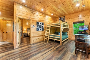 ✔ Bedroom #3 (Game/Bunk Room, Middle Lower Level): A combined bunk room within the game room, perfect to entertain kids! 1 Queen/Queen bunk bed (sleeping 4) all with upgraded mattresses, along with 65in Streaming TV. NOTE: The game/bunk room is an open room with no doors.
